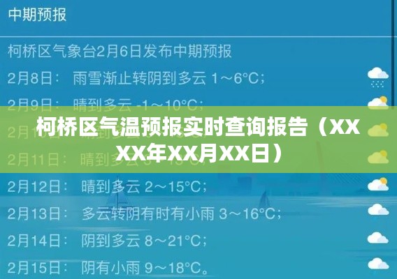 柯桥区作为浙江省的重要经济区域之一,其气候变化对居民生活和工作有着重要影响,本文旨在提供XXXX年XX月XX日的柯桥区气温预报实时查询报告,帮助公众了解当日天气状况,以便做好相应的准备和安排。