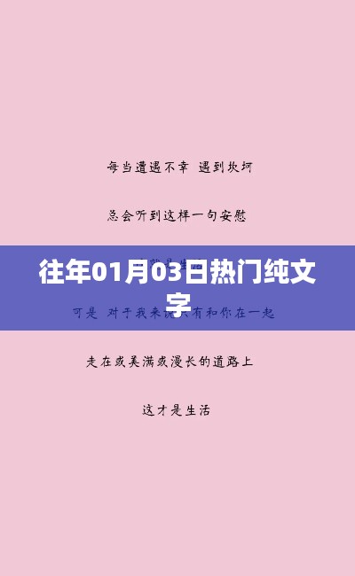 往年一月三日的热门纯文字内容丰富多彩,涵盖了节日氛围、时事热点、文化娱乐、情感交流和生活点滴等方面,这些纯文字内容,让我们更加了解当时的社会背景和人们的内心世界,也让我们感受到生活的美好和温暖,希望这篇文章能够带你走进往年一月三日的热门纯文字世界,感受到那一年的美好和回忆。